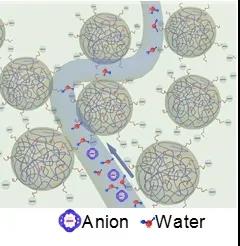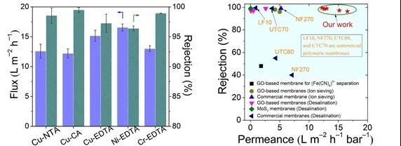 針對(duì)上述問題,張煒銘、潘丙才教授課題組借鑒納米仿生思路,首次提出通過軟物質(zhì)插層劑構(gòu)建類似水通道蛋白通道的新策略。研究以實(shí)現(xiàn)污廢水中重金屬絡(luò)合物的高效分離與水質(zhì)凈化為最終目標(biāo),首先制備出聚丙烯腈凝膠軟粒子(PAN GPs,1-8nm)作為氧化石墨烯(GO)膜的納米級(jí)插層劑,通過控制GO膜層間PAN GPs形變、溶脹以及PAN GPs-π作用實(shí)現(xiàn)了亞納米尺度的層間距離精確調(diào)控,與此同時(shí)GO膜規(guī)整的層狀結(jié)構(gòu)得以充分保留。此外,通過堿性處理可在PAN GPs表面產(chǎn)生電荷和雙疏水/親水性,有機(jī)融合了水通道截留性與水的快速滲透,成功構(gòu)建出類似水通道/蛋白通道結(jié)構(gòu)。研究結(jié)果表明,該GO復(fù)合膜可截留96%以上的重金屬絡(luò)合離子(Cu-NTA、Cu-CA、Cu-EDTA、Ni-EDTA、Cr-EDTA),水通量是文獻(xiàn)報(bào)道同類膜的4-13倍。這一研究深入探究了納米級(jí)軟顆粒插層劑與氧化石墨烯薄片之間的相互作用及其高水通和高截留的限域分離構(gòu)效機(jī)制,提出的軟顆粒插層策略有望成為設(shè)計(jì)和研制高性能水處理二維復(fù)合膜的新方向。